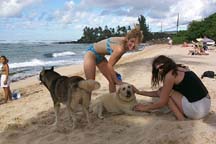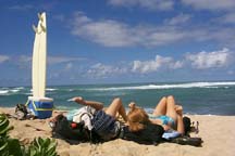 .....[Note the BROKEN surf board!] there were TONS of sea turtles swimming right along the shore!!! Apparently the Native Hawaiians honor the sea turtles and consider them the "guardians of the sea". Knowing this fact did nothing to make Monique less terrified of swimming with them! Mostly Mimi and I stayed on the beach with all the other surfer chicks and waited for our surfer dude to come back to the beach. We'd like to take this opportunity to complain about the sun dowm here.....I guess us mountain/plains girls CANNOT get a tan from this island sun!! Tomorrow we are going to skip the sunscreen for a bit and see if we cannot get some color!
