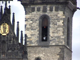 as you cant see,this tower has bells that ring on the hour, and a person rings it by hand! You can see him hard at work here ->