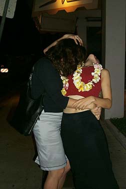 Paul finally called us back (he blew us off for days, he is just so busy with all his many dates) so we went to meet Erik and Paul at Dukes on the beach. And we got Lei'ed again! Paul is so good to us. I forget what flower this is on Coki below, but it smelled soooo good! We still have them in the room and they are the most fragrant flowers I have ever seen.